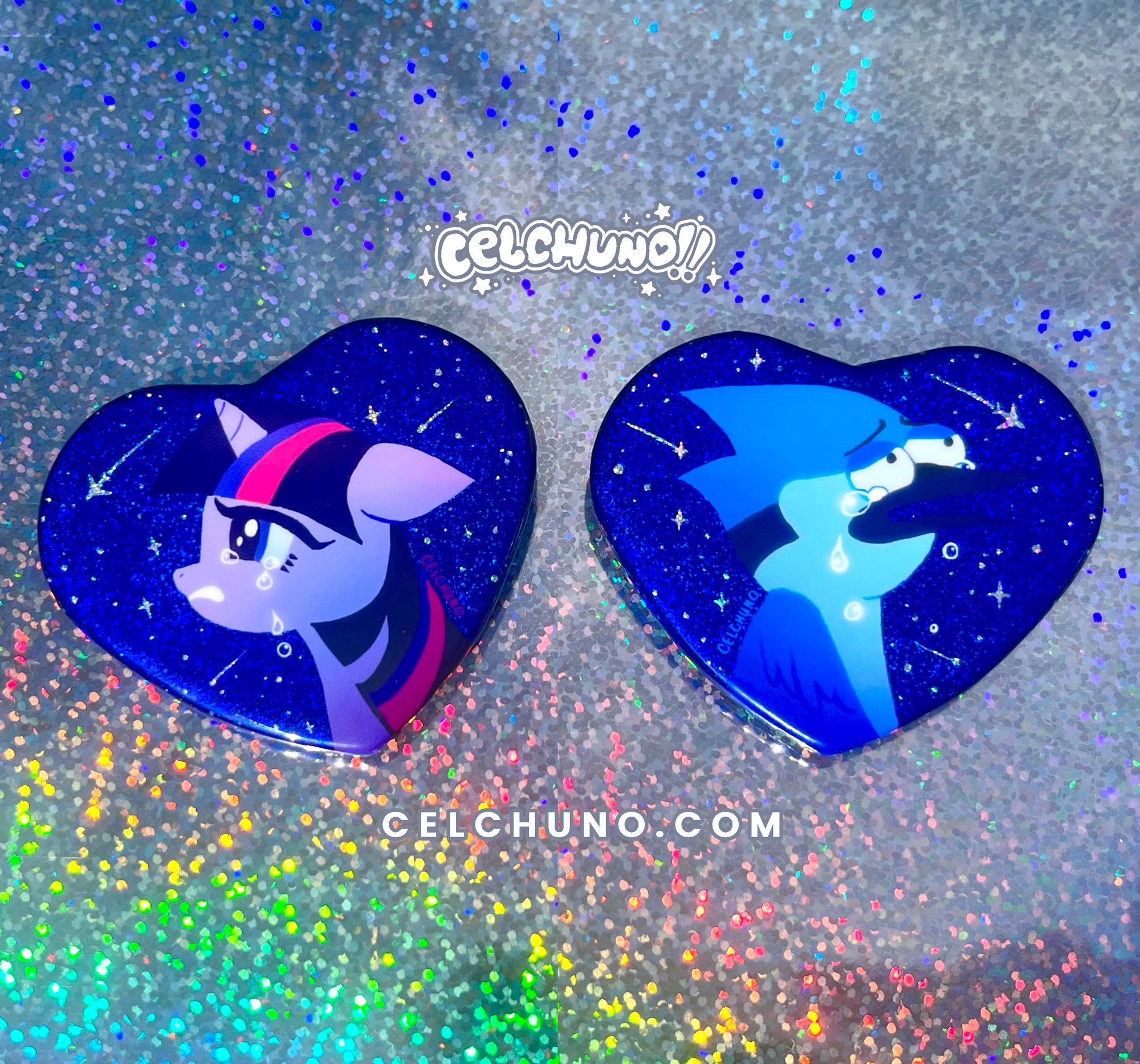 - Buttons have a spot glitter finish and heart shape